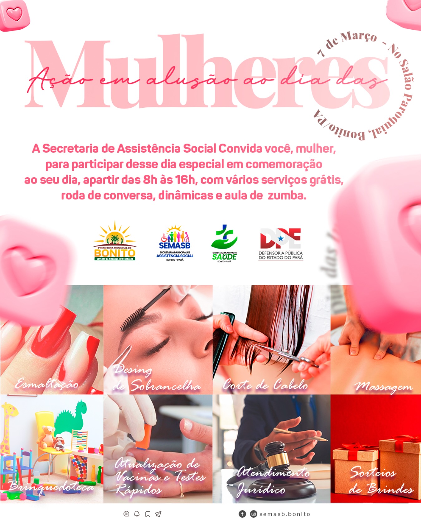 A Prefeitura de Bonito/PA, por meio da Secretaria Municipal de Assistência Social, realizou no dia 7 de março de 2025 um evento especial em homenagem ao Dia Internacional da Mulher, promovendo um momento de valorização, cuidado e celebração da força feminina no município.
