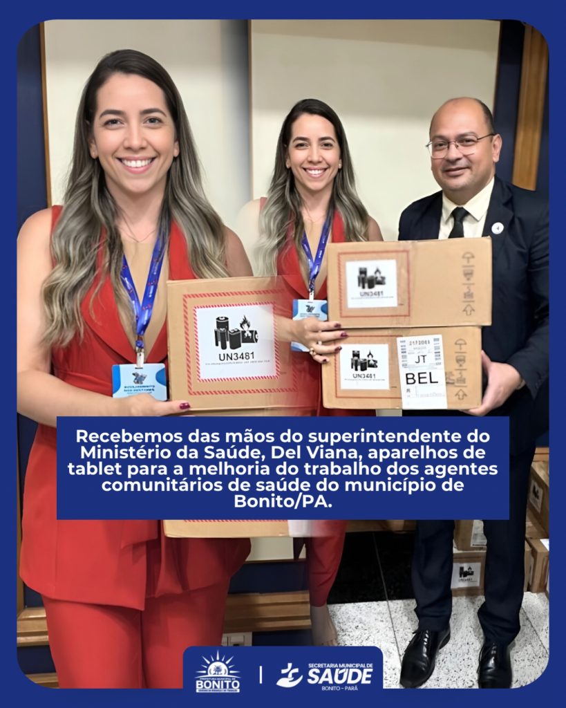 A Prefeitura de Bonito/PA recebeu novos tablets entregues pelo Ministério da Saúde, por meio do superintendente Del Viana, com o objetivo de fortalecer o trabalho desenvolvido pelos agentes comunitários de saúde no município.